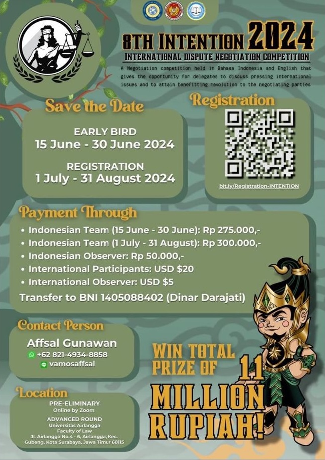 AE is responsible for organizing the International Dispute Negotiation Competition (INTENTION). Held annually by ILSA Chapter UNAIR, INTENTION is a prestigious competition for law students from Indonesia and around the world. Participants are challenged to apply their legal knowledge and negotiation skills in simulated international dispute scenarios, enhancing their oral advocacy and problem solving skills in the process.