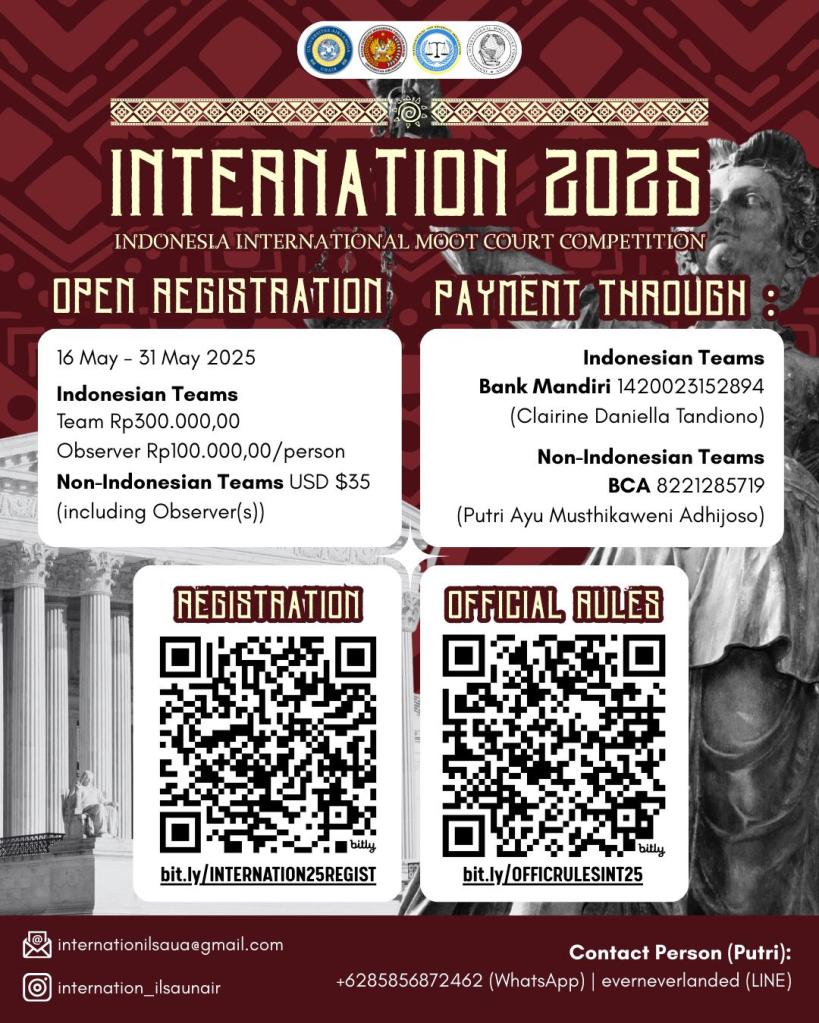 INTERNATION is an annual international moot court competition organized by ILSA Chapter UNAIR. Aimed at beginner mooters, INTERNATION provides a stepping stone for law students interested in getting their first taste of IMCCs. Every year, INTERNATION invites Indonesian and foreign law students to participate, developing their skills in legal research and oral advocacy.
